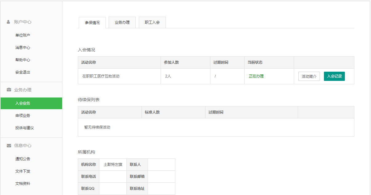 點擊左側(cè)導航欄【入會業(yè)務(wù)】按鈕,點擊【參保情況】按鈕進入?yún)⒈G闆r頁面,入會情況列表顯示的是該單位所參與的活動列表可查看“活動簡介”、“入會記錄”等信息。下方待續(xù)互列表,可顯示該單位可進行續(xù)互的活動列表,點擊該列表中“續(xù)互”按鈕,可對相應活動進行續(xù)互。底部的所屬機構(gòu)展示的是單位所屬機構(gòu)的信息,如下圖所示。