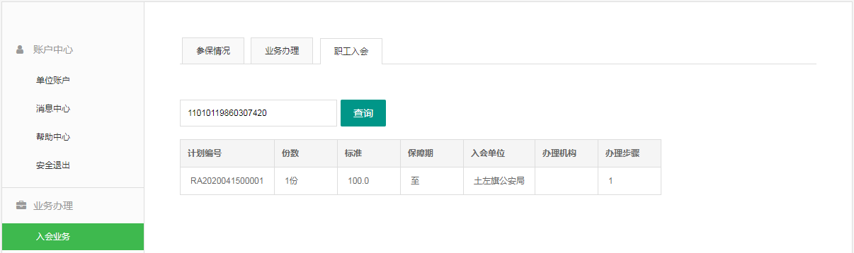點擊左側(cè)導航欄【入會業(yè)務(wù)】按鈕,點擊【職工入會】按鈕進入職工入會記錄頁面,通過身份證號查詢職工的入會記錄信息,如下圖所示。