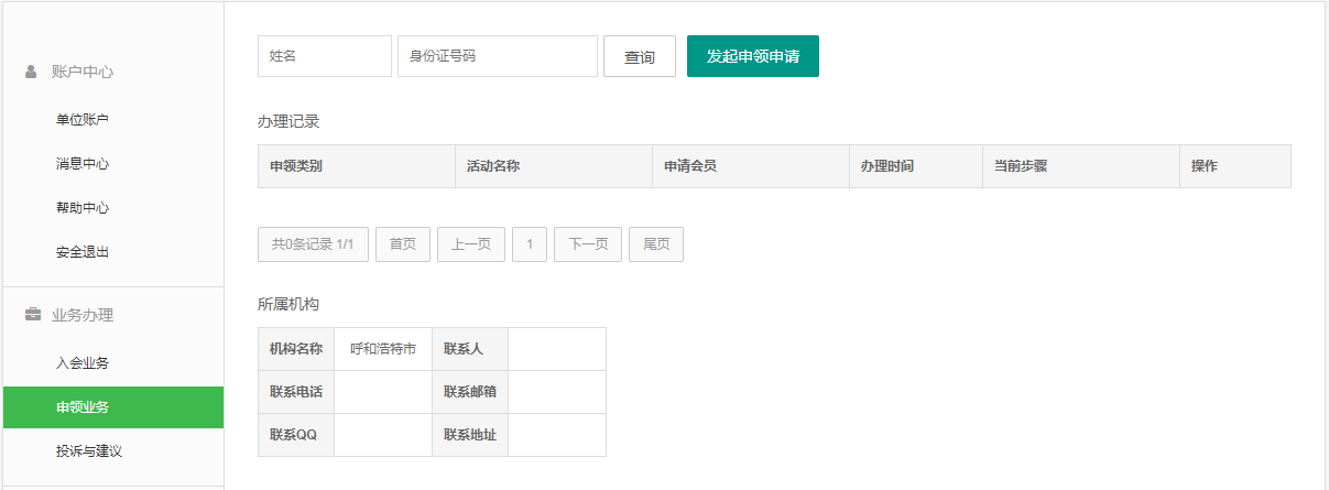 (一)使用單位賬號登錄后,點擊左側(cè)導航欄的【申領(lǐng)業(yè)務(wù)】進入申領(lǐng)列表頁面,如下圖所示: