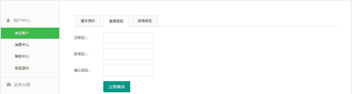 如需修改密碼,點擊左側(cè)導航欄【單位賬號】按鈕,點擊【登錄密碼】按鈕進入密碼修改頁面,輸入正確的舊密碼、新密碼、確認密碼(確認密碼與新密碼一致),點擊【立即修改】按鈕進行修改,修改成功后返回登錄頁面,重新登錄,如下圖所示。
