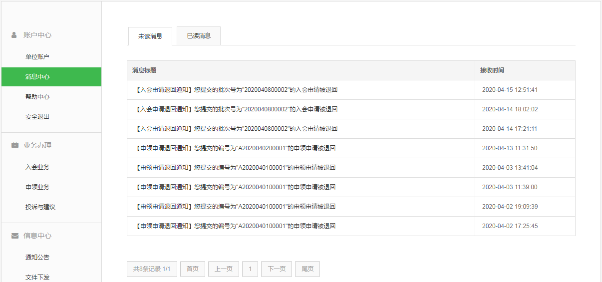 點擊左側(cè)導航欄的【消息中心】,點擊【未讀消息】選項卡進入未讀消息列表頁面,點擊其中一條消息可進行消息詳情查看,已查看的消息會標記為已讀,將會移入已讀消息列表,如下圖所示。