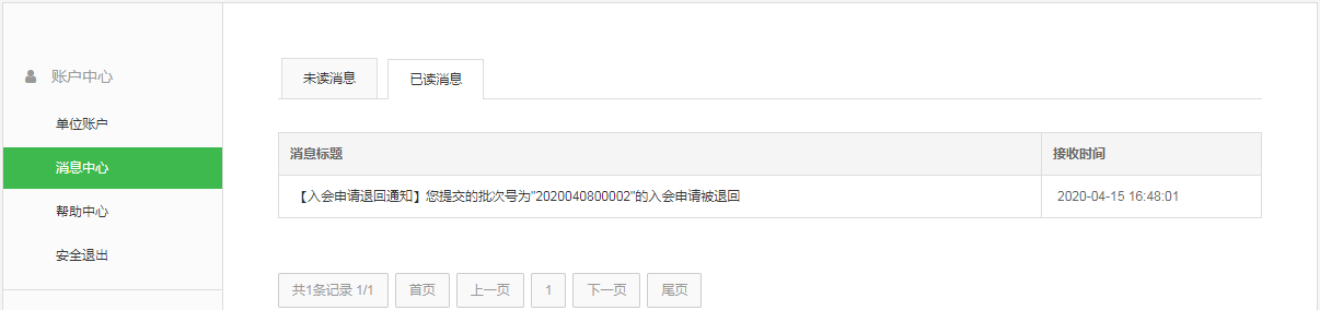 點擊左側(cè)導航欄的【消息中心】,點擊【已讀消息】選項卡進入已讀消息列表頁面,點擊其中一條消息可進行消息詳情查看,如下圖所示。