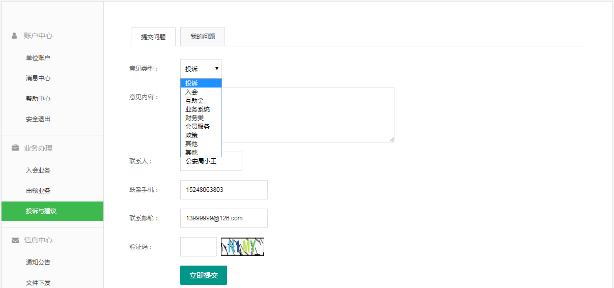 點擊左側(cè)導航欄的【投訴與建議】,點擊【提交問題】選項卡進入提交問題頁面,選擇常見問題類型,填寫意見內(nèi)容、聯(lián)系人、聯(lián)系手機、聯(lián)系郵箱、驗證碼,點擊“立即提交”按鈕,進行意見反饋,如下圖所示。