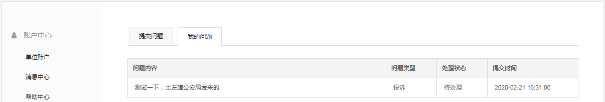 點擊左側(cè)導航欄的【投訴與建議】,點擊【我的問題】選項卡進入我的問題列表頁面,查看自己提交的意見反饋情況,點擊其中一條數(shù)據(jù)進入查看詳細反饋情況,如下圖所示。