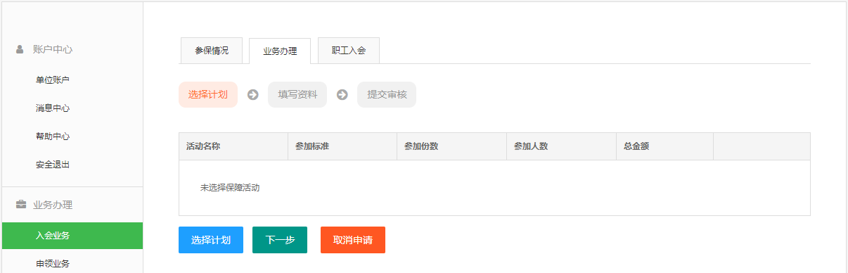 (二)點擊對應入會業(yè)務(wù)(【發(fā)起入會申請業(yè)務(wù)】或【發(fā)起涉密入會申請業(yè)務(wù)】)按鈕,進入添加計劃頁面,如下圖所示。