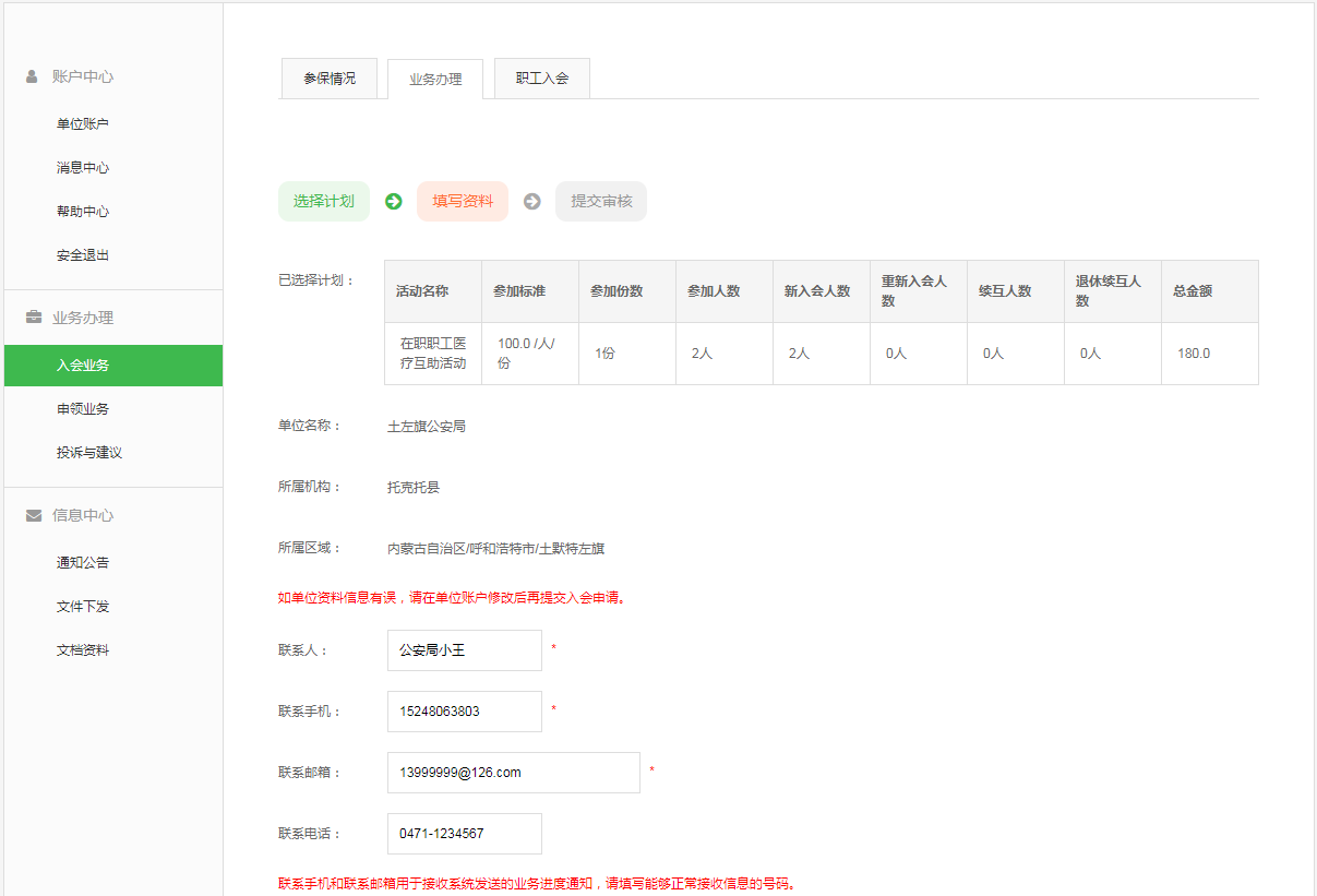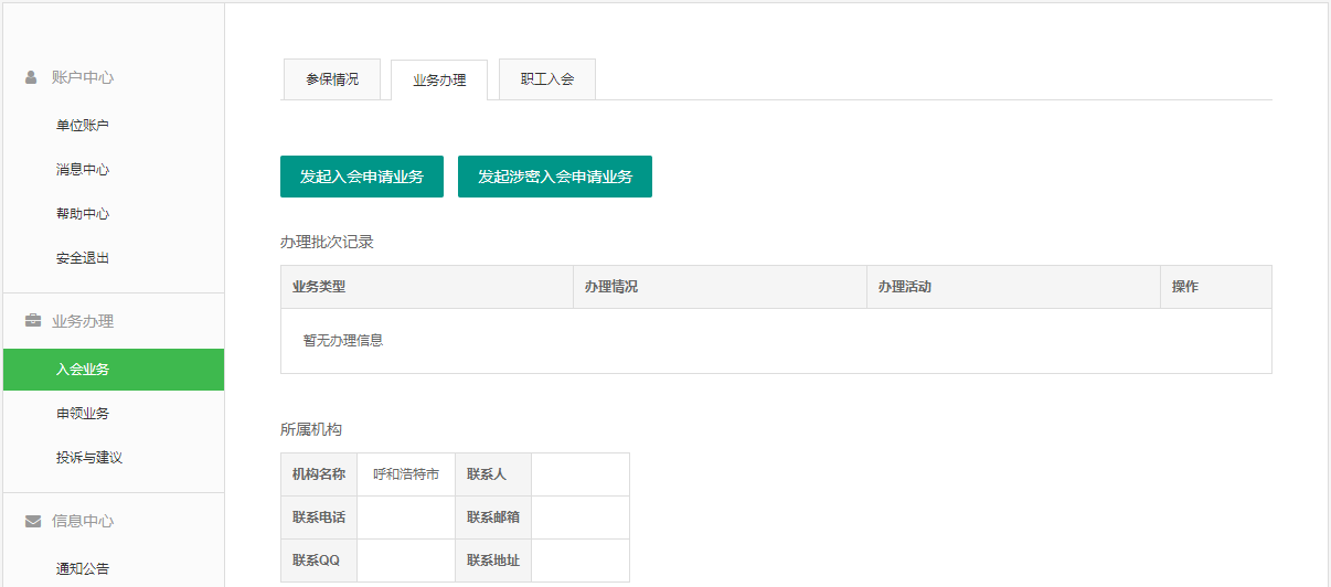 (一)使用單位賬號登錄后,點擊左側(cè)導航欄的【入會業(yè)務(wù)】,然后點擊【業(yè)務(wù)辦理】選項卡進入業(yè)務(wù)辦理頁面,如下圖。