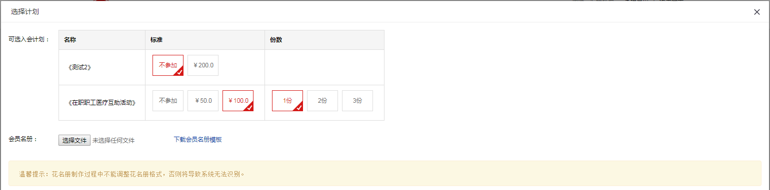 (四)選擇所要參加的計劃、標準,點擊【下載會員名冊模板】按鈕,下載會員名冊模板,按模板填寫需要入會的會員信息后,點擊【選擇文件】按鈕進行上傳,然后點擊下方【確定】按鈕。