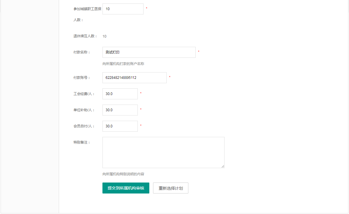 (五)點擊【下一步】按鈕,進入資料填寫頁面,填寫對應單位信息、付款信息等,填寫完成后點擊【提交到所屬機構(gòu)審核】按鈕即可,如下圖所示。