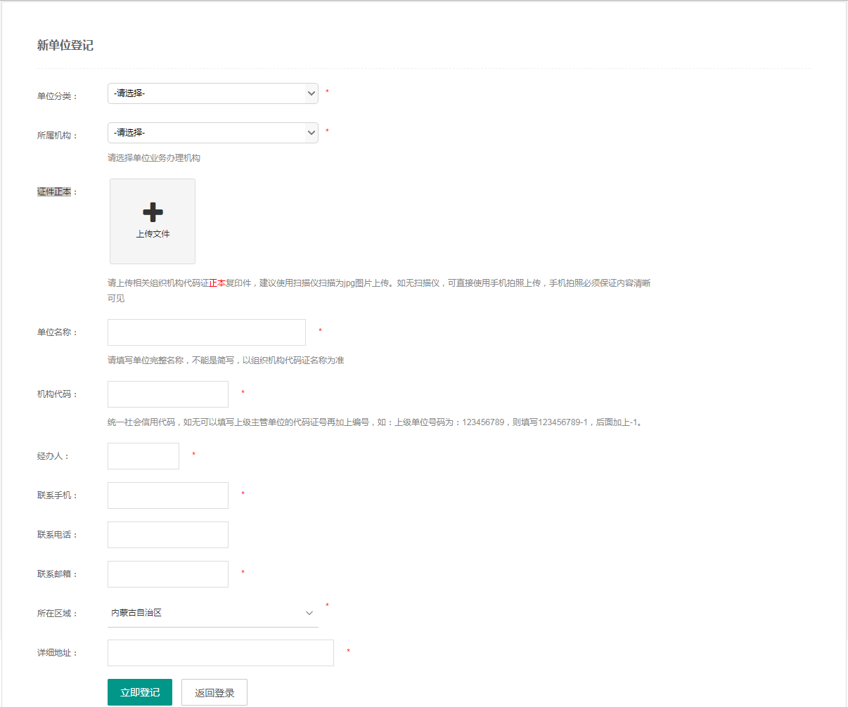 注意:直接上傳證件正本,系統(tǒng)掃描出單位名稱,機構(gòu)代碼信息,用戶須檢查正確性。