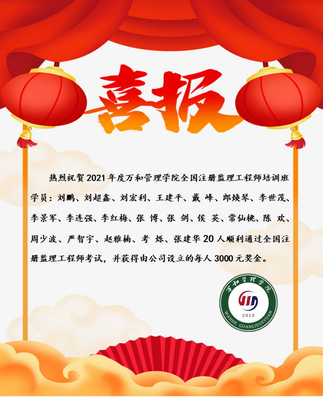 2021年注冊監(jiān)理工程師考試于近日公布成績,內(nèi)蒙古萬和工程項目管理有限責任公司再創(chuàng)佳績,共有20人通過考試,成功獲取全國注冊監(jiān)理工程師執(zhí)業(yè)資格。